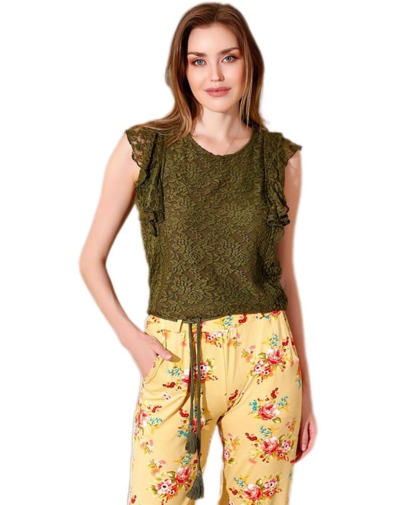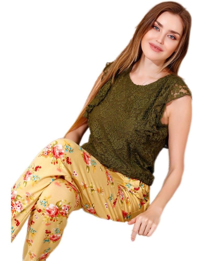البيجامة البيتي مكونة من قطعتين البادي ويميزه اللون الزيتوني الفخم مع بنطلون باللون البرتقالي الفاتح و منقوش بالورد الرقيق، صنعت هذه البيجامة النسائية من خامة القطن المريح والمحبوب في الأوقات الحارة مع الدانتيل الناعم على البشرة رقيق الملمس.